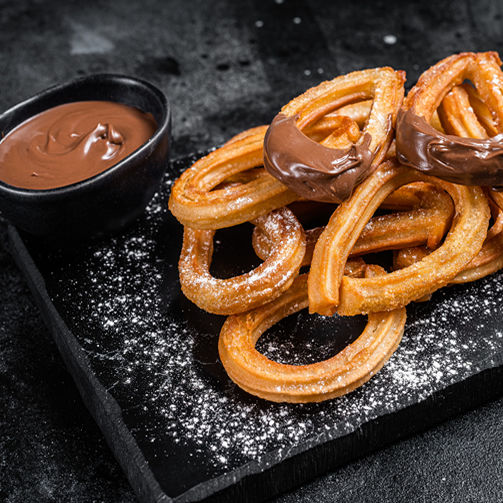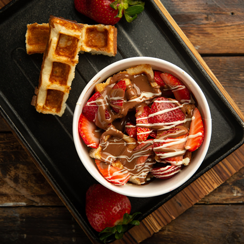 Nutella & toffee sauce drizzled over a hot Belgian waffle topped with Reese’s peanut butter cups.